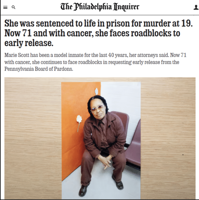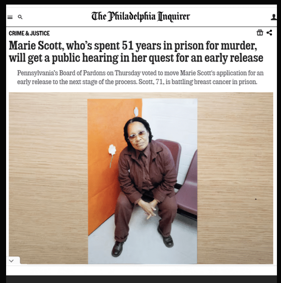 The Philadelphia Inquirer, 3/6/25: “Pennsylvania’s Board of Pardons on Thursday voted unanimously to grant Marie Scott, who has served 51 years behind bars for murder, a public hearing — a critical step in her quest to be considered for an early release from prison.